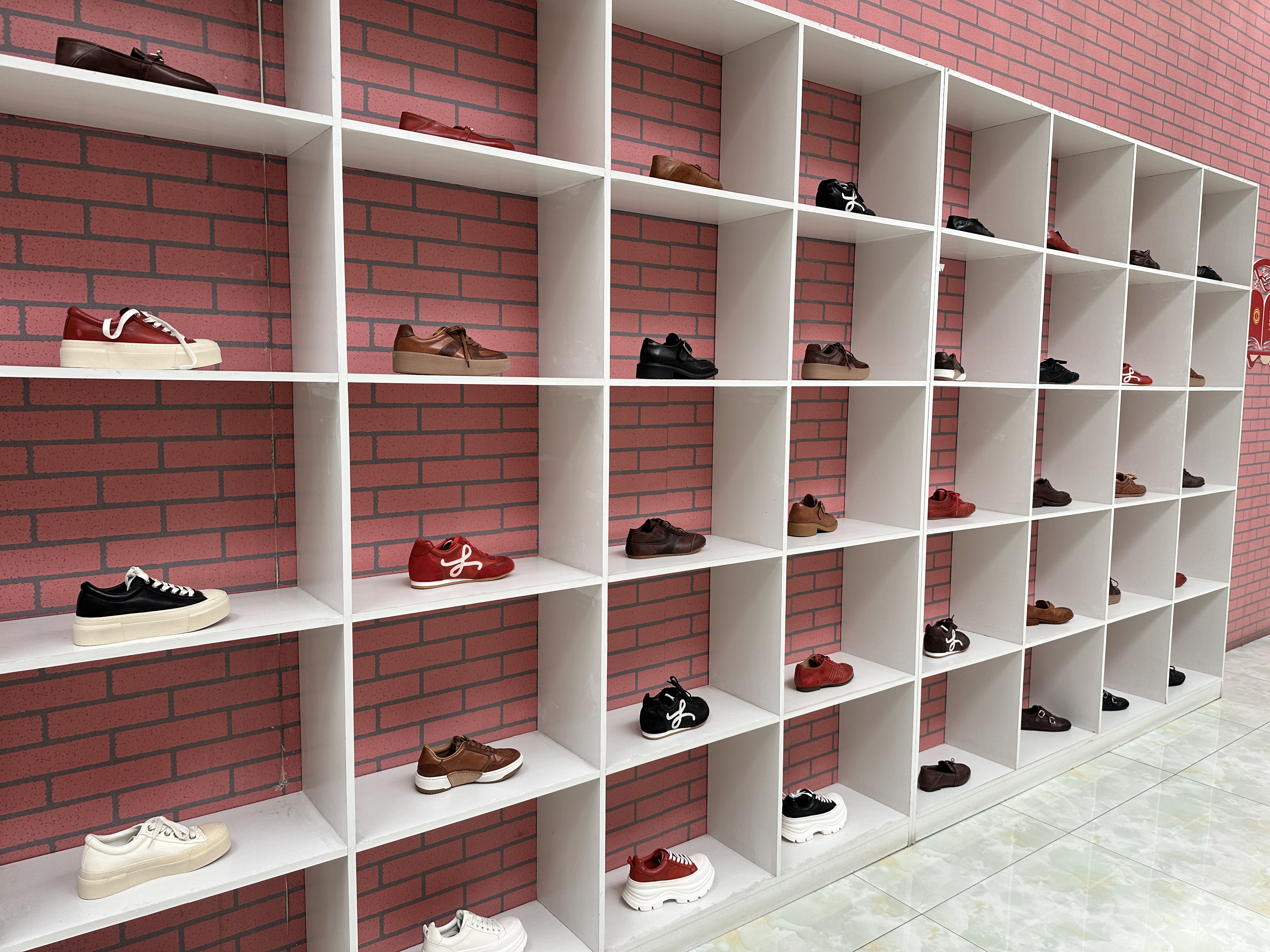 “阿么手工女鞋”公司内部长廊整齐摆放着各类款式女鞋